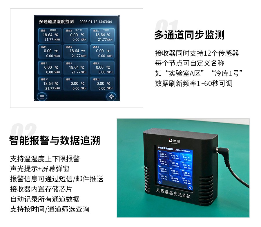 無線溫濕度采集系統(tǒng)是一款高精度、多通道、易部署的環(huán)境監(jiān)測解決方案,由無線溫濕度傳感器和無線接收器兩部分組成。系統(tǒng)采用瑞士Sensirion原裝溫濕度探頭,結(jié)合2.4G無線通信技術(shù)與工業(yè)級顯示模塊,支持多只傳感器同步監(jiān)測,適用于實驗室、倉儲、農(nóng)業(yè)大棚、機房等多場景的溫濕度實時監(jiān)控與數(shù)據(jù)追溯。