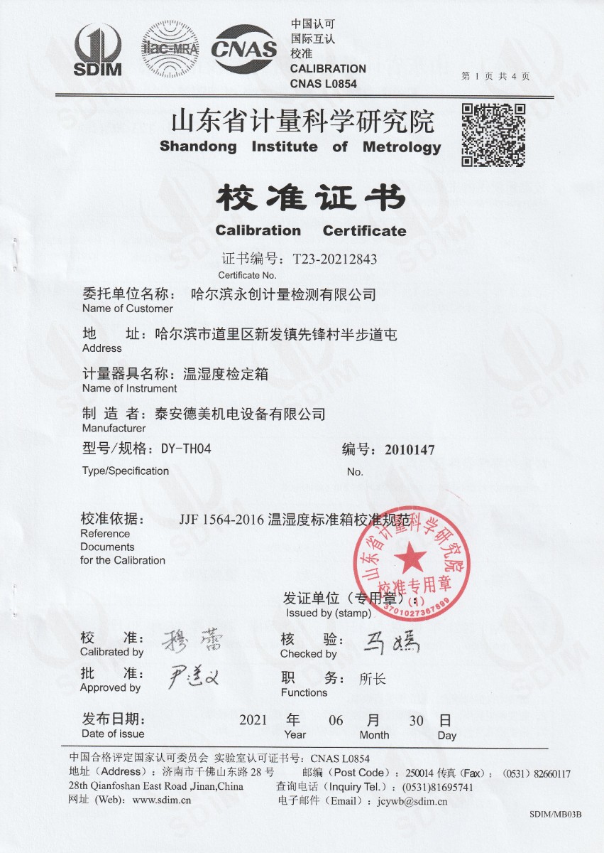 哈爾濱永創(chuàng)計量檢測有限公司-溫濕度檢定箱 2021-7-3 本文被閱讀 16345 次