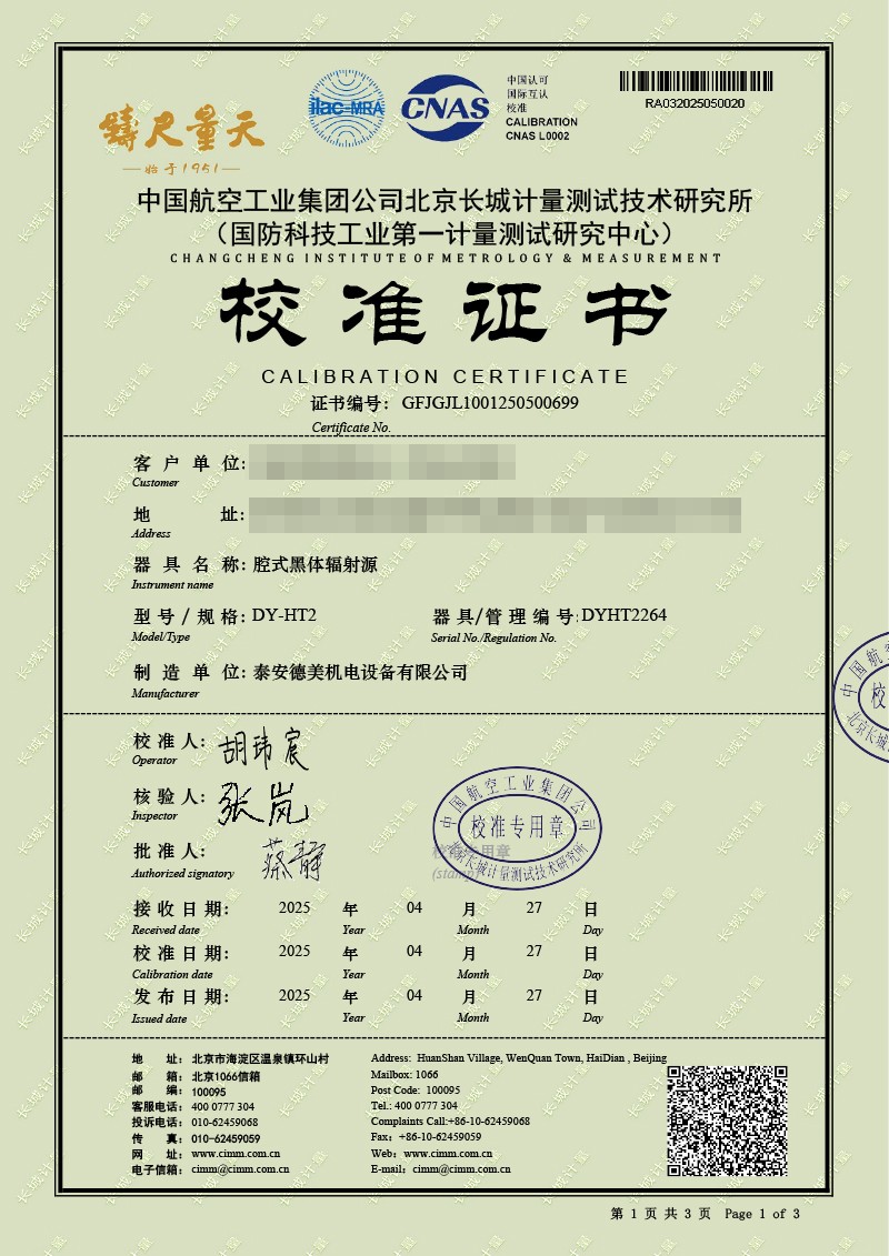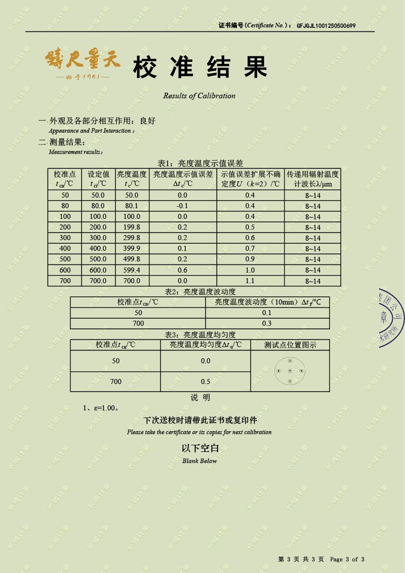 腔式黑體輻射源(50-700℃)校準證書 2025-5-9 本文被閱讀 3354 次
