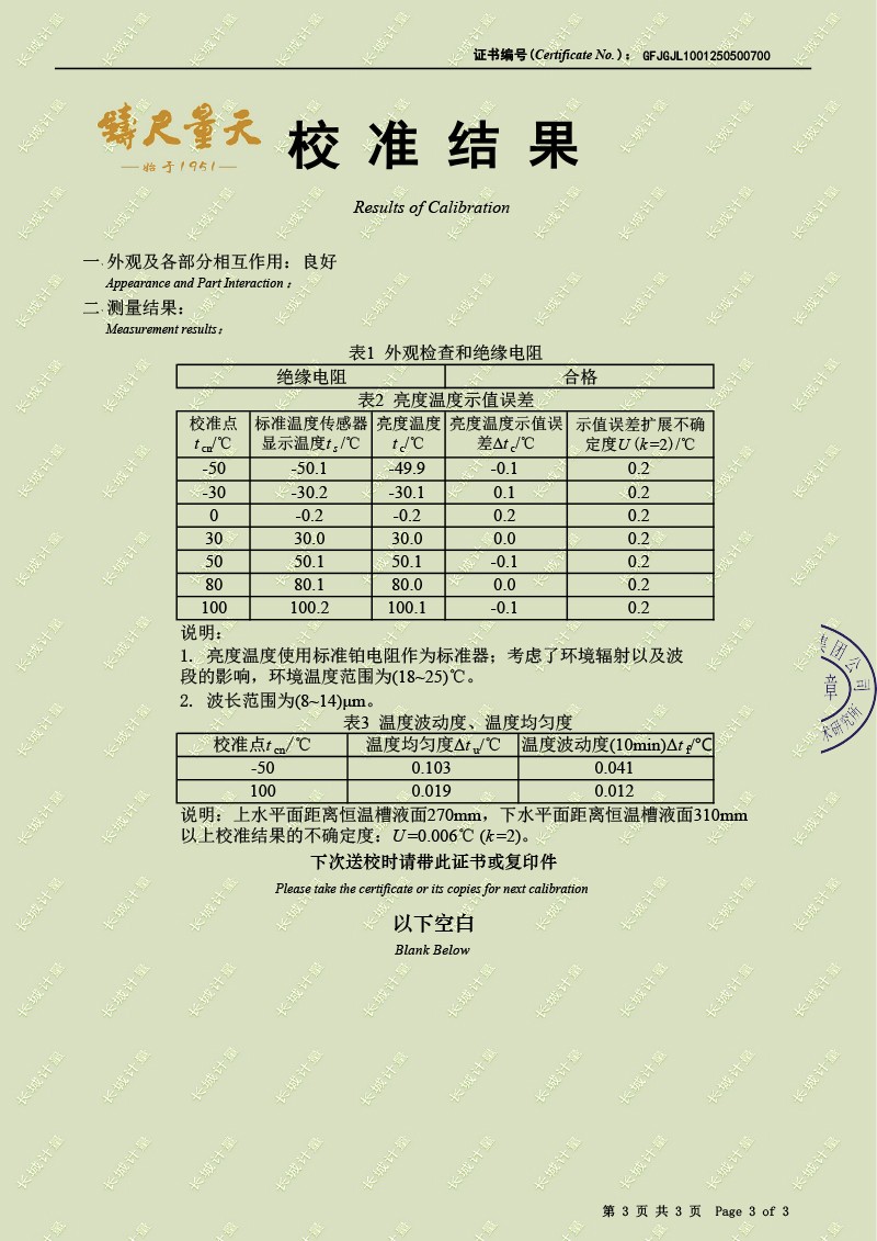 | 上一條:腔式黑體輻射源(50-700℃)校準(zhǔn)證書 | 下一條:溫度數(shù)據(jù)采集儀校準(zhǔn)證書 |