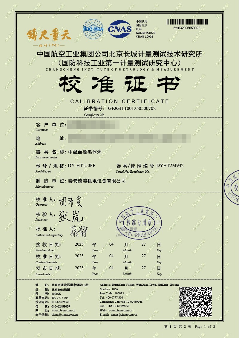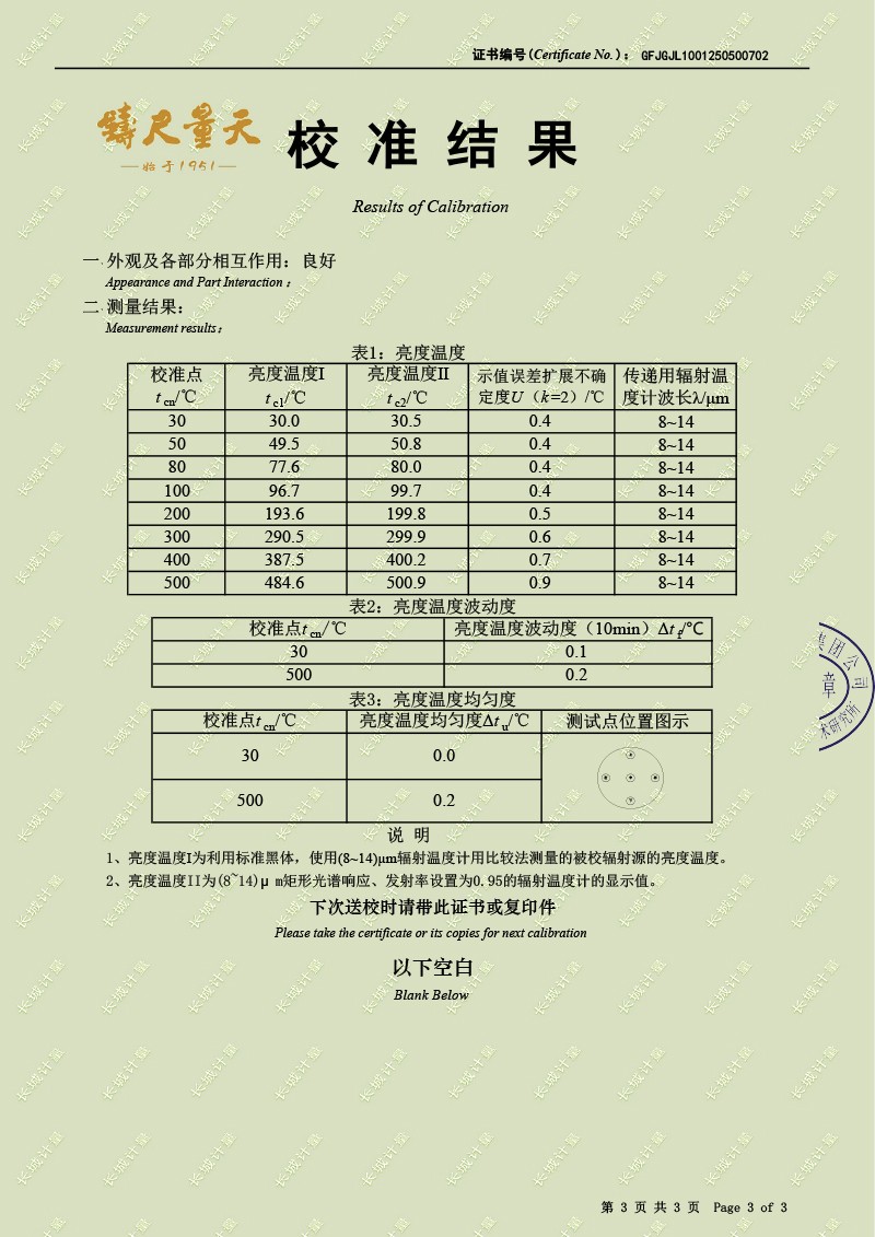 | 上一條:腔式黑體輻射源(-50-100℃)校準(zhǔn)證書 | 下一條:露點儀校準(zhǔn)系統(tǒng)校準(zhǔn)證書 |