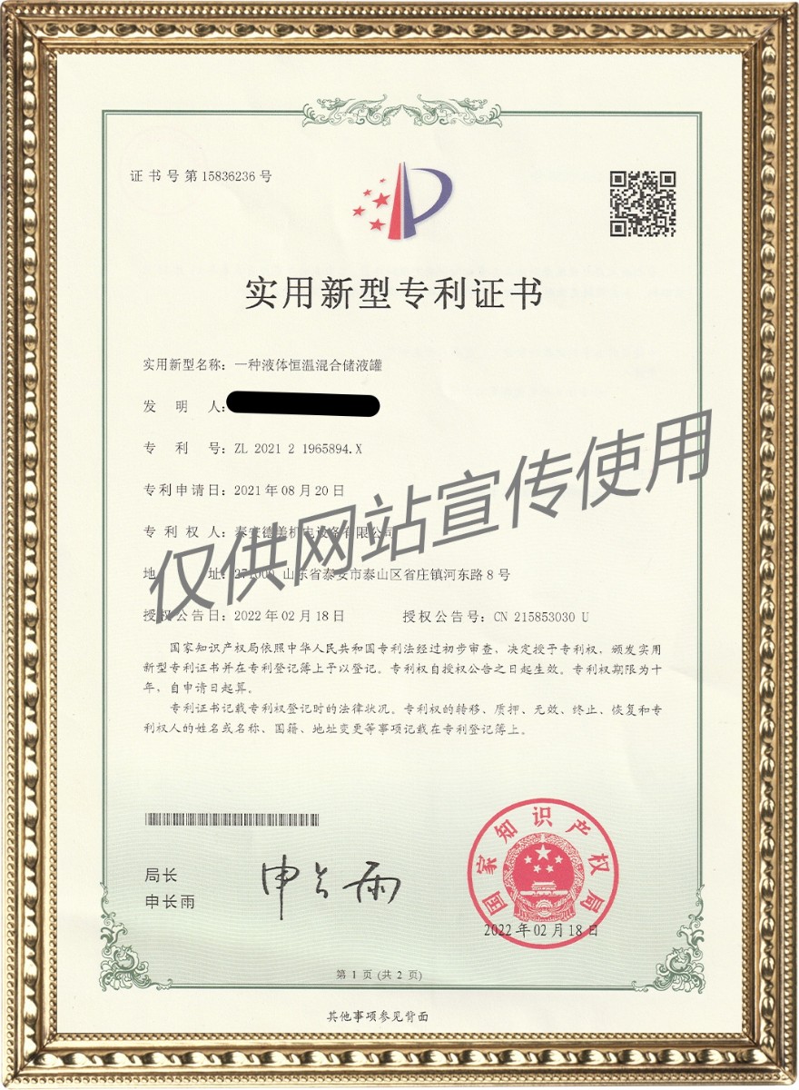 一種液體恒溫混合儲(chǔ)液罐——實(shí)用新型專利證書