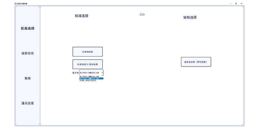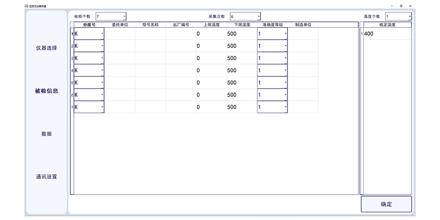 溫度變送器計量校準(zhǔn)上位機軟件,此軟件適合溫度變送器的輸出電流采集,軟件需要溫度變送器(帶傳感器)配套標(biāo)準(zhǔn)器、恒溫設(shè)備及相應(yīng)數(shù)字萬用表。軟件可選擇多個被檢傳感器,可設(shè)置采集次數(shù),及溫度個數(shù)及溫度點。軟件可輸入委托單位,型號名稱出廠編號及準(zhǔn)確度等級及制造單位。