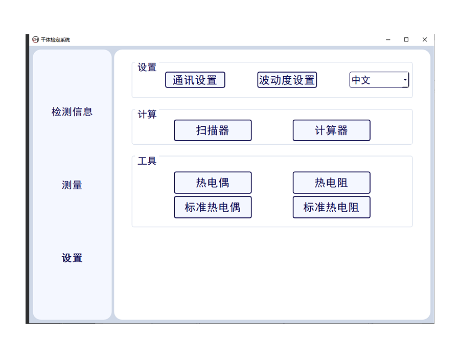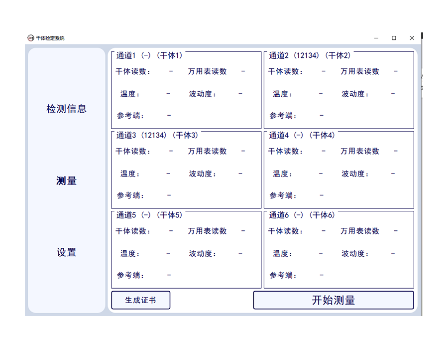 測(cè)量狀態(tài)可進(jìn)行多通道狀態(tài)干體爐,萬(wàn)用表讀數(shù)。當(dāng)前標(biāo)準(zhǔn)器溫度,溫度波動(dòng)性等數(shù)據(jù)的讀取,并一鍵生成證書(shū)??蓪?shí)現(xiàn)一鍵中英文切換。