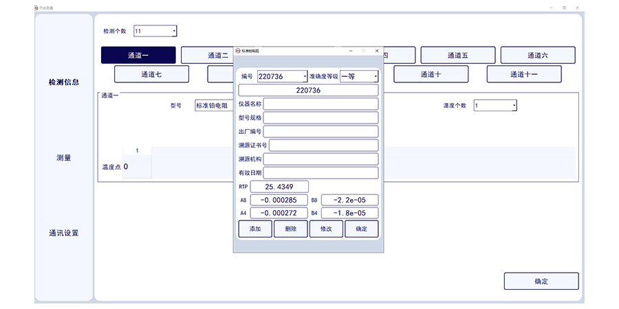 此套軟件可讀取1-11路標(biāo)準(zhǔn)通道的數(shù)字萬用表的電壓數(shù)值,標(biāo)準(zhǔn)溫度值,并一鍵轉(zhuǎn)換溫度值,并實(shí)現(xiàn)溫度波動(dòng)度計(jì)算,可確定干體溫度校驗(yàn)爐與標(biāo)準(zhǔn)器溫度的差值??梢绘I生成證書數(shù)據(jù)。
