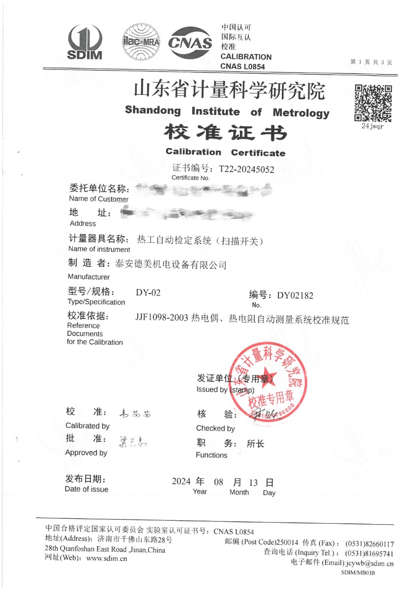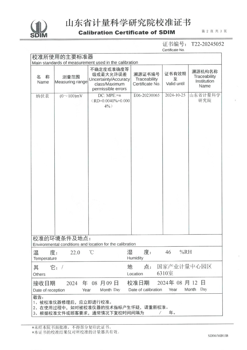 | 上一條:表面溫度計(室溫+5~400℃)校準(zhǔn)證書 | 下一條:溫度數(shù)據(jù)采集儀校準(zhǔn)證書 |