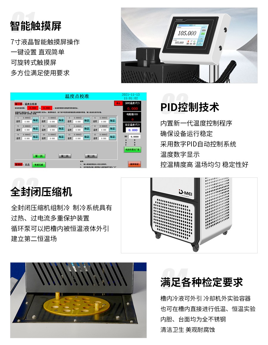 DY-RTS05制冷恒溫槽(0℃~95℃)是高精度自控式溫度檢定設備,控溫精度高,溫場均勻,穩(wěn)定性好,操作方便,采用全封閉壓縮機制冷系統(tǒng),外殼和內(nèi)膽都采用全不銹鋼材料制造,產(chǎn)品供計量部門作一、二等標準水銀溫度計,貝克曼溫度計。工業(yè)鉑熱電阻,標準銅-康銅熱電偶檢定之用,也可作高精度熱、冷源供生產(chǎn)、科研使用。制冷恒溫槽是一種高精度自控式數(shù)顯溫度檢定裝置,它具有溫度穩(wěn)定性好,溫場均勻,控溫精度高等特點。制冷系統(tǒng)采用全封閉制冷機,具有噪音低、可靠性好、壽命長。數(shù)顯溫控儀按PID調(diào)節(jié)規(guī)律實現(xiàn)溫度自動控制,結(jié)構(gòu)緊湊、操作方便、槽溫讀數(shù)直觀。適用于各計量、生化、石油、氣象、能源、環(huán)保、醫(yī)藥等部門及生產(chǎn)溫度計、控溫器等廠家進行物理參數(shù)的檢測,并可為其他實驗研究工作提供恒溫源。