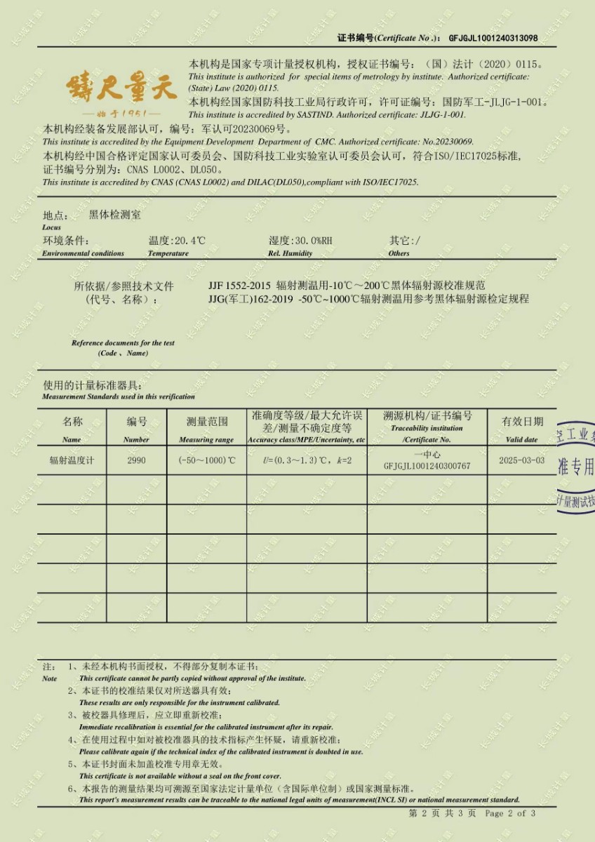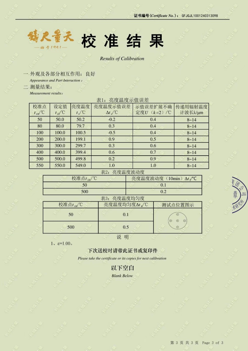 黑體輻射源校準(zhǔn)證書 2024-4-11 本文被閱讀 7071 次