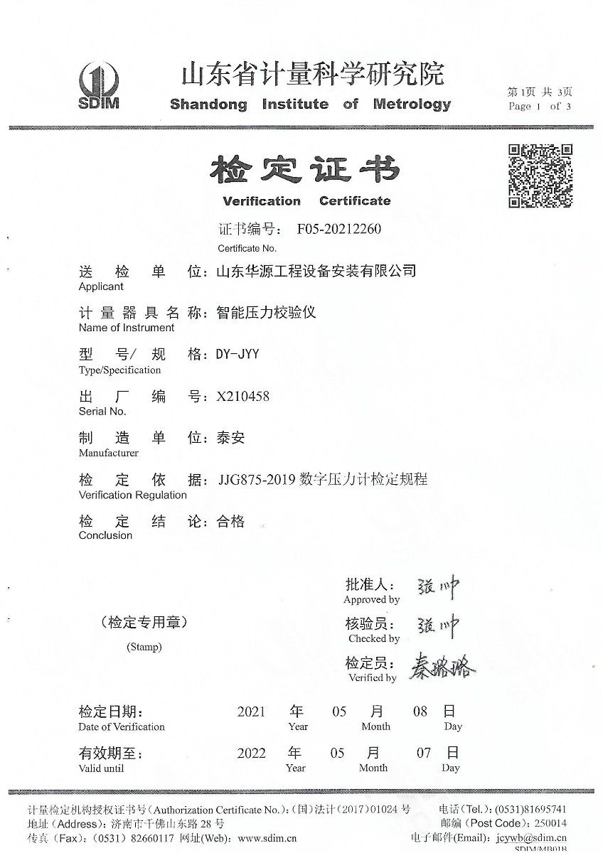 | 上一條:山東華源工程設(shè)備安裝有限公司-智能壓力校驗儀X210457 | 下一條:廉金屬熱電偶檢定爐-校準證書 |