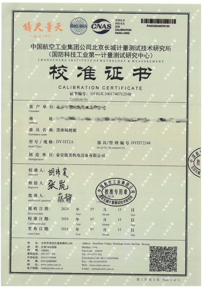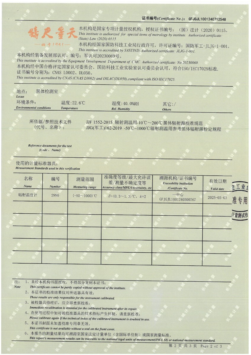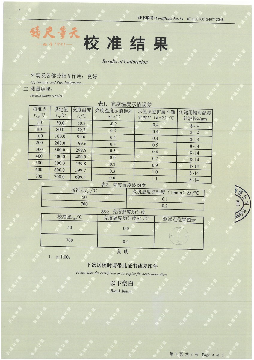 黑體(50~700℃)校準證書 2024-7-29 本文被閱讀 10183 次