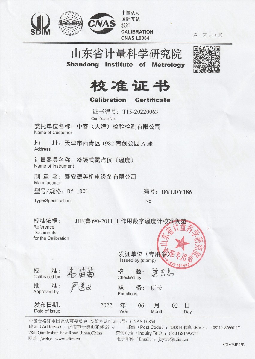 中睿(天津)檢驗檢測有限公司-冷鏡式露點儀校準(zhǔn)證書 2022-6-14 本文被閱讀 15548 次