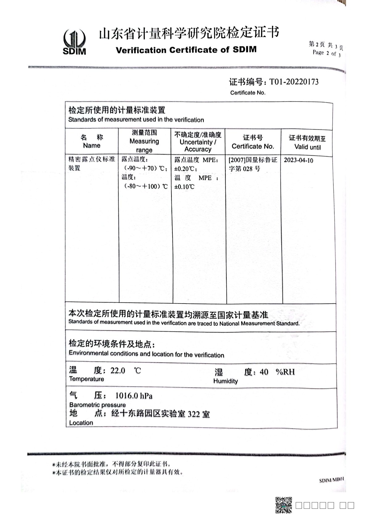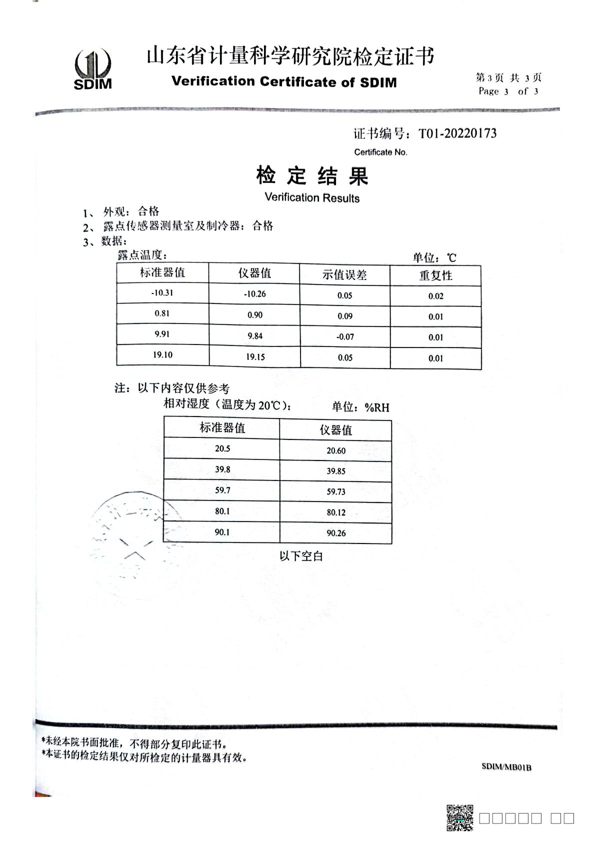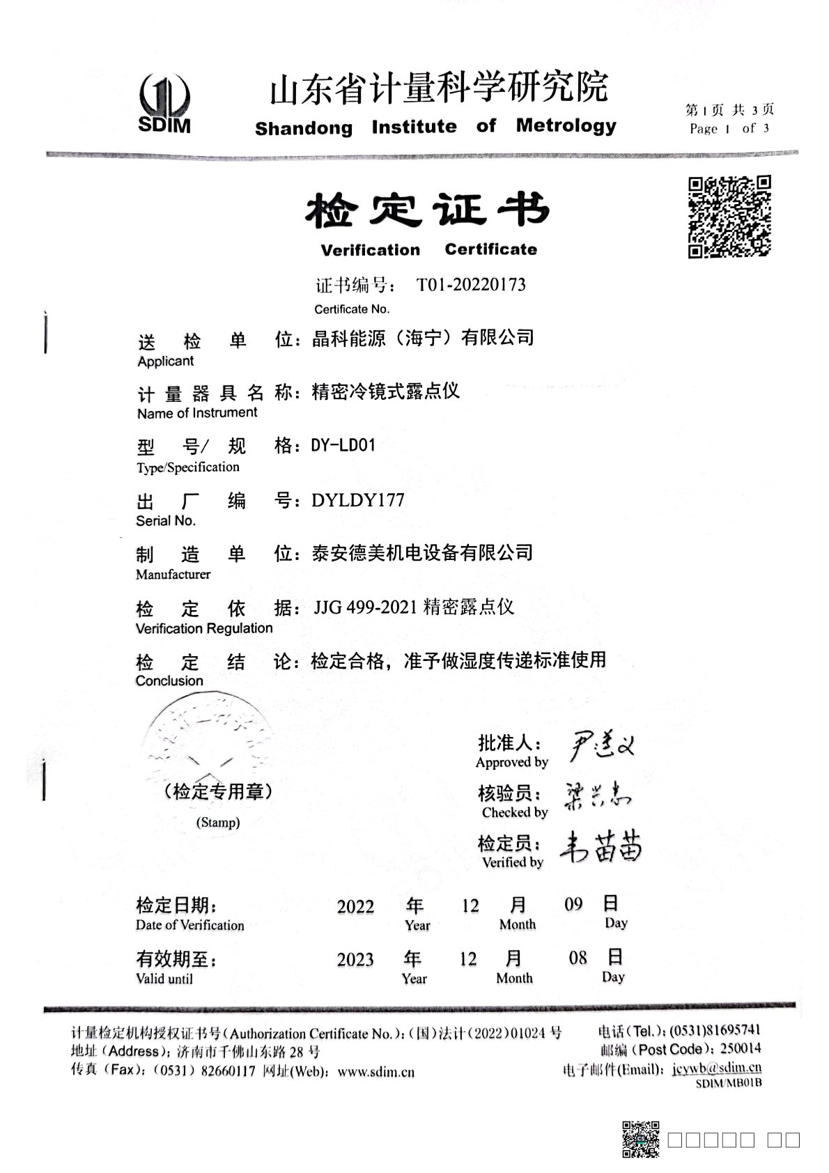 晶科能源(海寧)有限公司 精密冷鏡式露點儀 檢定證書 2023-1-12 本文被閱讀 13194 次