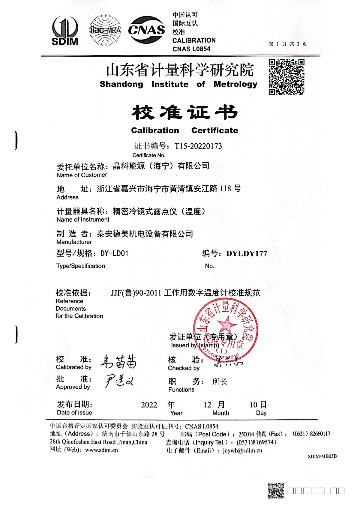 | 上一條:晶科能源(海寧)有限公司 精密冷鏡式露點(diǎn)儀 檢定證書 | 下一條:溫度數(shù)據(jù)采集儀校準(zhǔn)證書 |