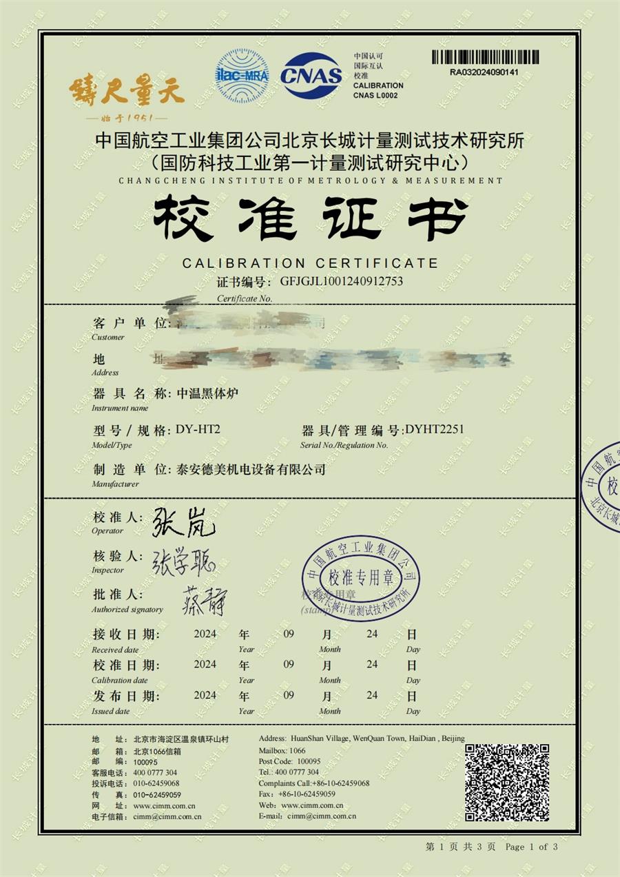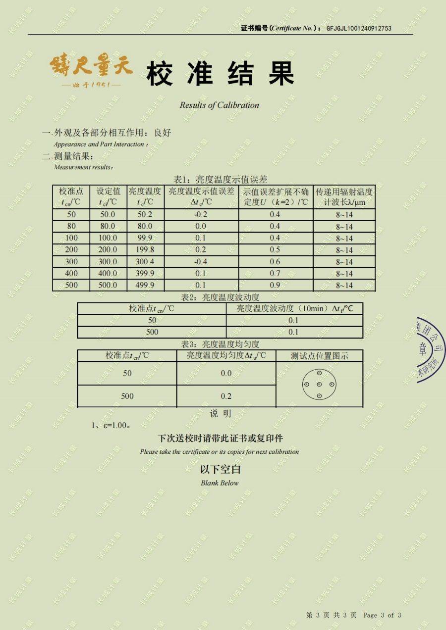| 上一條:高溫黑體爐(300-1200℃)校準(zhǔn)證書 | 下一條:廉金屬熱電偶檢定爐-校準(zhǔn)證書 |