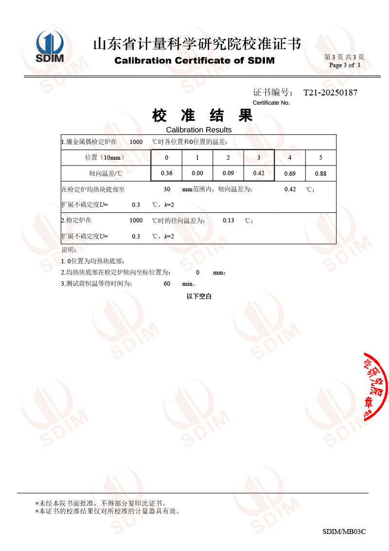 廉金屬熱電偶檢定爐(300-1200℃)校準(zhǔn)證書