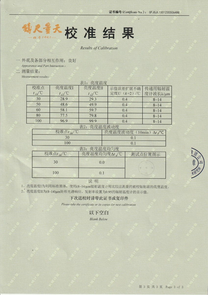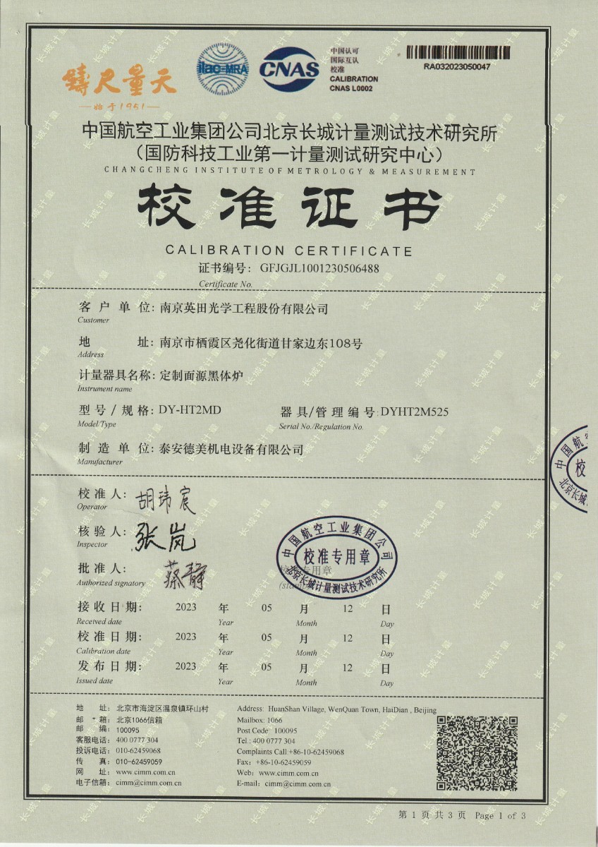 南京英田光學工程股份有限公司 定制面源黑體爐 校準證書 2023-5-26 本文被閱讀 11491 次