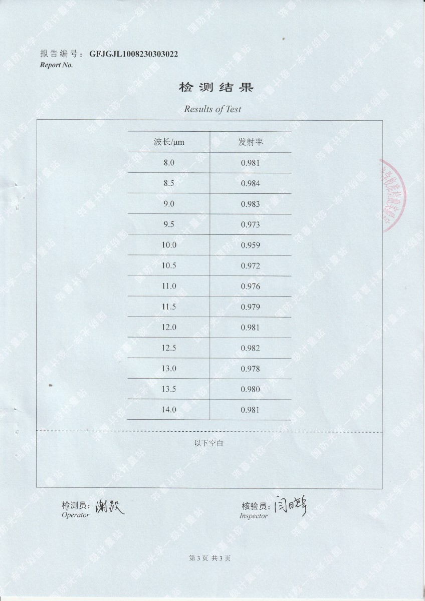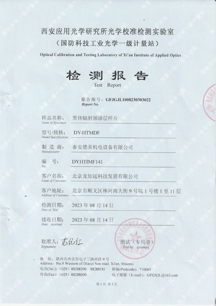 | 上一條:北京龍知遠(yuǎn)科技發(fā)展有限公司-黑體輻射源涂層樣片DYHT1MF140檢測(cè)報(bào)告 | 下一條:廉金屬熱電偶檢定爐-校準(zhǔn)證書 |