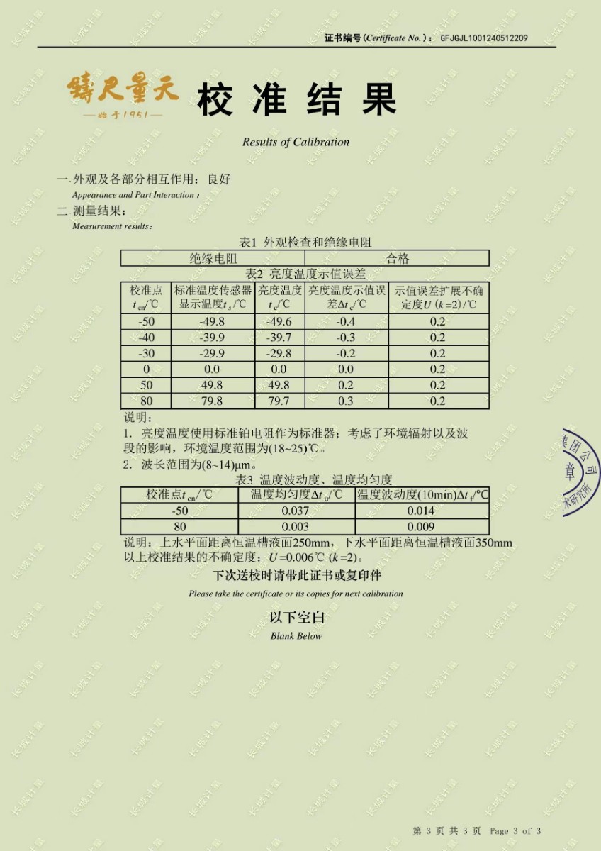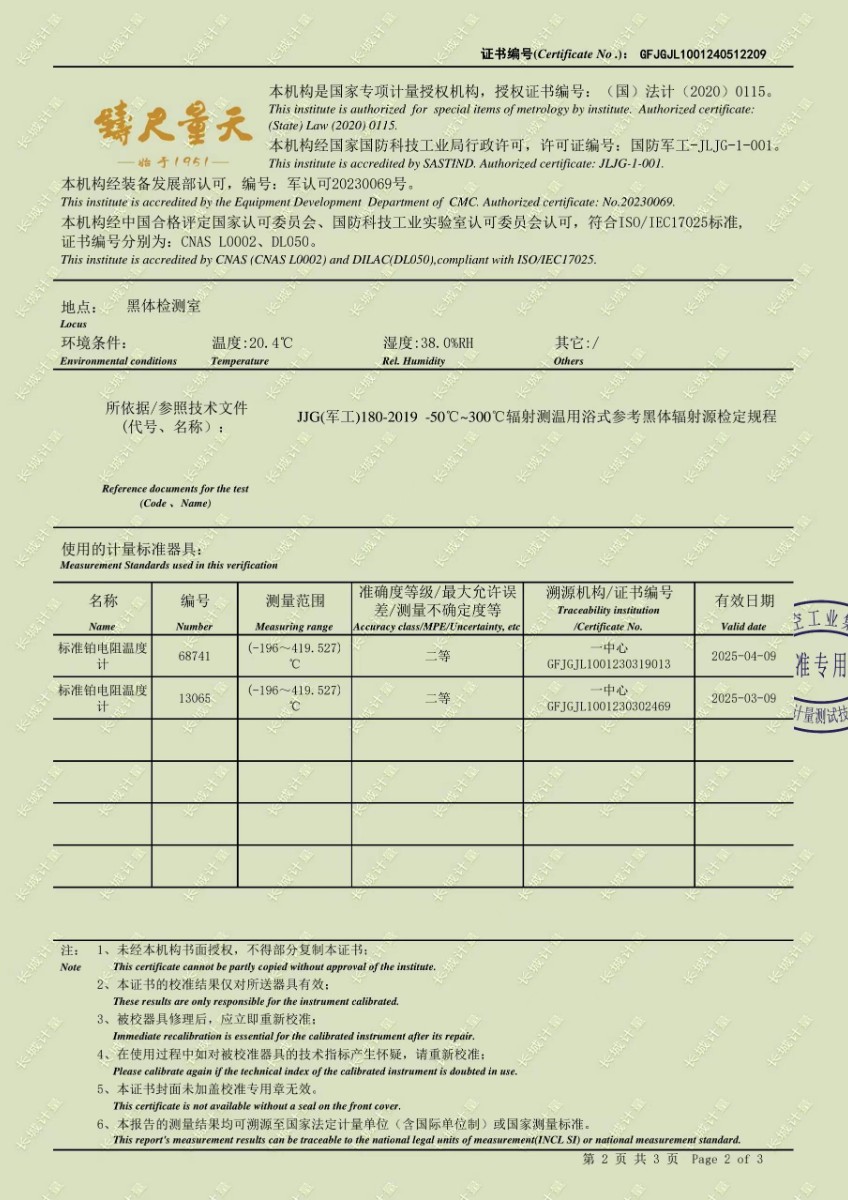 低溫浴式黑體輻射源校準證書 2024-5-31 本文被閱讀 8697 次